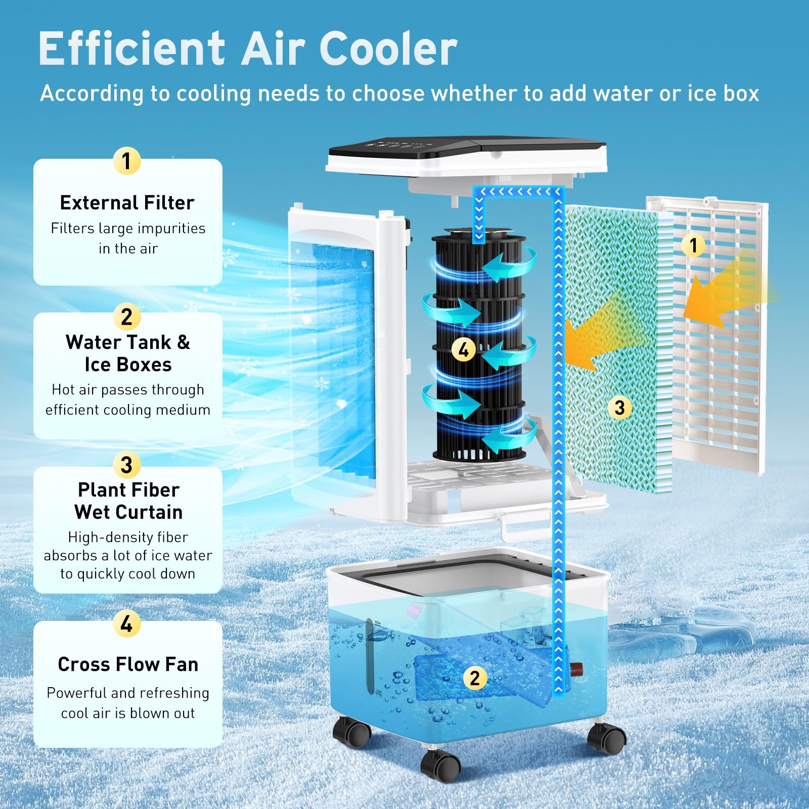 El tanque de agua de gran volumen permite hasta 24 horas de funcionamiento continuo a baja velocidad. Incluye 3 bolsas de hielo reutilizables para un enfriamiento aún más efectivo. El tanque superior e inferior facilita el llenado sin necesidad de agacharse.